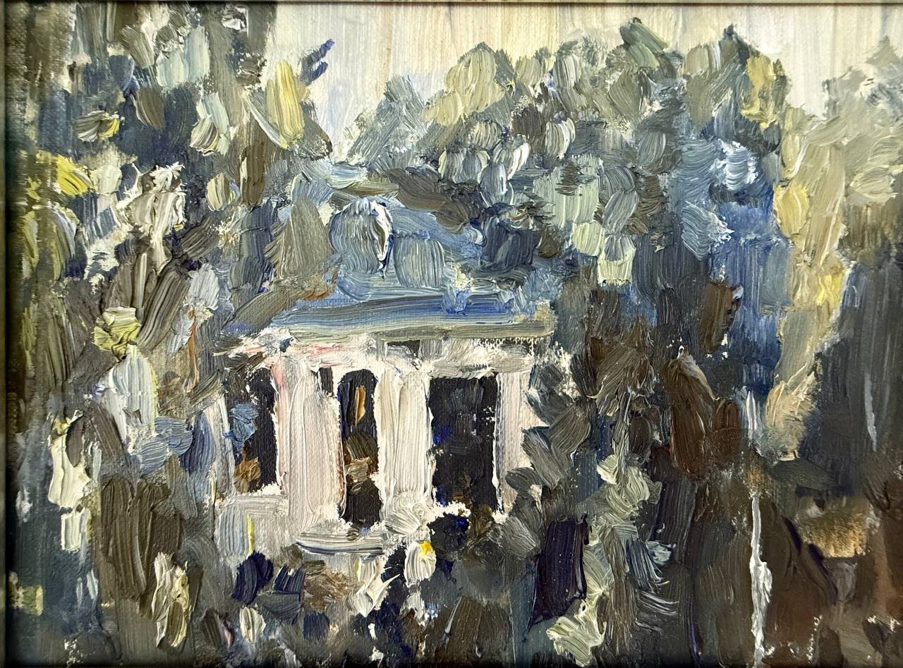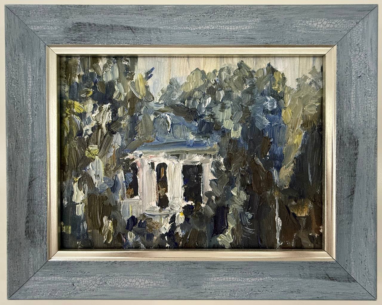 Thick, textured brushstrokes in mossy greens, muted blues, and warm earthy browns create a living tapestry around the small white structure. Gentle flickers of light filter through the foliage, lending an ethereal glow that invites the viewer to pause, breathe, and wander inside the scene.