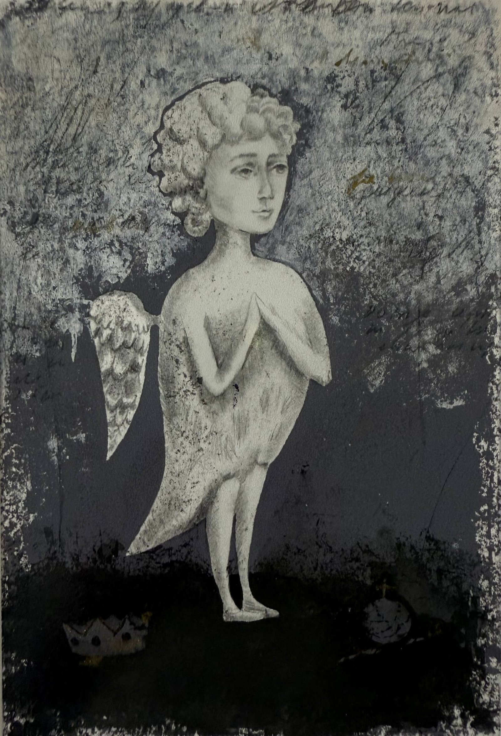 Rendered in deep blacks and smoky grays, the moody monochromatic palette is softened by the pale luminosity of the figure’s single wing. The distressed, layered background evokes the feeling of ancient walls bearing silent stories, as if the painting itself guards a secret history.